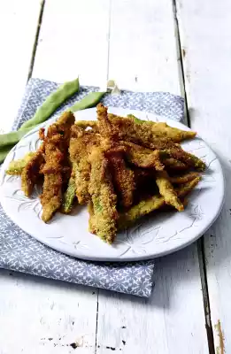 In a deep plate, mix 4 tablespoons of flour and 150 g breadcrumbs. In a second deep plate whisk 3 eggs (size M) with salt and pepper. Turn the beans first in the egg, then in the breadcrumb mixture and mix por-.