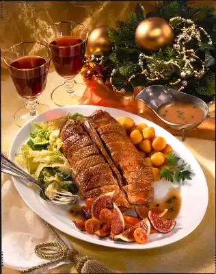 Season to taste with salt, pepper and cognac. Stir in peppercorns. Cut open goose breast and arrange on a plate together with potato balls, savoy cabbage and the fruits. Garnish with parsley as desired and serve.