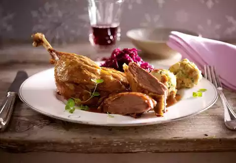 Take the goose parts out of the oven. Remove goose breast from the bone and cut into slices. Lift out dumplings. Arrange everything.