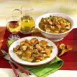 Heat butter in a pot. Sauté shallots and potatoes in it. Gradually add 1/4 litre stock and simmer for 12-15 minutes. In the meantime grate parmesan finely. Mix salad and orange vinaigrette. Add orange slices and fold in carefully. Fold the parmesan into the potato risotto. Take the legs out of the oven and keep warm. Deglaze the meat with sherry and the rest of the orange juice. Place in a saucepan and skim off the fat. Bring sauce to the boil. Season with salt and pepper. Arrange everything together and garnish with orange peel, pink berries and mugwort