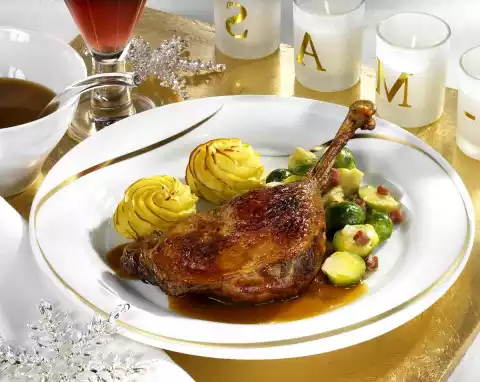 Finely dice the bacon and leave it crispy. Peel, chop and add 1 onion and fry until transparent. Swivel the Brussels sprouts in it. Stir starch with a little water until smooth. Thicken the sauce with it. Season to taste with salt and pepper. Serve everything. Duchess potatoes or boiled potatoes