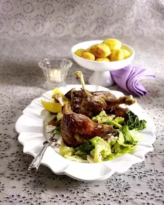 After 30 minutes, pour approx. 200 ml goose stock into the vegetables. About 10 minutes before the end of the roasting time, brush the legs with cold salted water and fry until crispy. Wash the potatoes thoroughly and cook covered in boiling water for about 15 minutes.