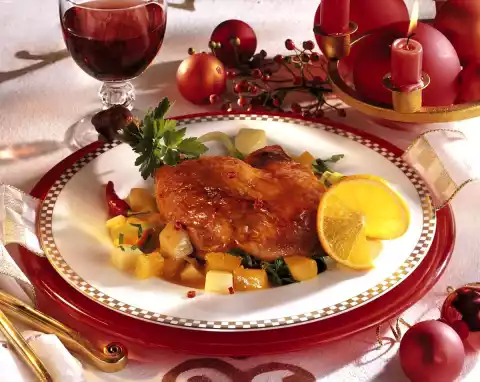 Measure out 3/4 litre stock and gradually deglaze the legs with it. 40 minutes before the end of the frying time, place the potatoes on the fat pan and coat the legs several times with the honey mixture. 20 minutes before the end of the frying time, put the pumpkin and leek on the fat pan. Wash the parsley, dab dry and cut into strips. Take the fat pan out of the oven, take the legs down and mix the vegetables. Add chilli and parsley and season again with salt, pepper and chilli powder. Serve one goose leg with vegetables on each plate. Garnish as you like with parsley, chillies and orange slices