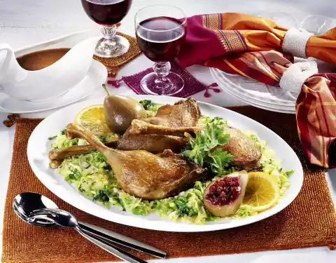 Wash goose legs, pat dry and season with salt and pepper. Place the legs with the skin side facing upwards on a fat pan. Pour on approx. 1/2 litre of water and bake in the preheated oven (electric range: 200 °C/ gas: level 3) on the lowest rack for approx. 1 1/2 hours. From time to time, pour the frying fat over it. Peel 2 onions and dice them roughly. Wash the pears. Spread the onions on the fat pan about 20 minutes before the end of the frying time.