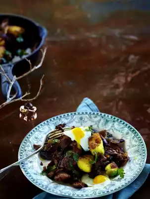 Heat 1 tablespoon of lard in a second pan. Fry quail eggs in it for 2-3 minutes until they become fried eggs. Arrange goose roast with fried eggs on plates.