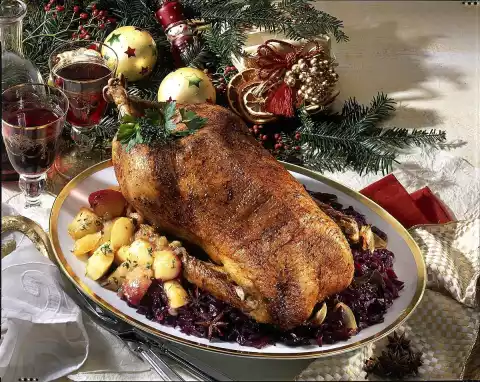 Remove excess fat from the inside of the goose and wash the goose thoroughly inside and out. Wash the throat, stomach, heart and liver as well. Season the goose inside and out with salt and pepper. Wash and quarter the apples and cut out the core. Cut apple quarters roughly into pieces and mix with thyme. Fill the goose with apples and put them on wooden skewers. Tie the legs and wings together with kitchen string and place the goose breast side down in a large roasting pan or on the fat pan of the oven. Pour on approx. 1/8 litre of water and roast in the preheated oven (electric cooker: 200 °C/ gas: level 3) for 3 1/2-4 hours. In between pour on broth and coat the goose with apple brandy. Turn the goose after about half the roasting time. Peel and quarter 2 onions. Clean, wash and roughly cut the carrots into pieces. About 1 1/2 hours before the end of the cooking time, spread the vegetables, neck and offal except for the liver, around the goose and fry with it. Fry the liver for the last 20-30 minutes. Meanwhile clean and wash the red cabbage and cut into fine strips. Peel the rest of the onions and chop them coarsely. Heat clarified butter in a large pot, fry red cabbage and onions briefly. Pour on red wine and apple juice, add bay leaf, cloves, allspice and star anise and season with salt and pepper. Cover and cook for about 50 minutes. 10 minutes before the end of the cooking time stir in currant jelly and vinegar. Season red cabbage with salt, pepper and possibly some sugar. Keep the finished goose warm and pour the cooking stock through a sieve. Dissolve the roast with a little water and pour into the stock. Degrease the stock (approx. 200 ml fat), bring to the boil and pour in the sauce thickener while stirring. Bring the sauce to the boil again briefly, refine with cream and season with salt and pepper. Arrange the goose with the filling on the red cabbage and garnish with parsley and thyme as desired. Add sauce extra. Boiled potatoes taste good with it