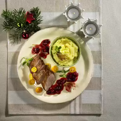 Pour frying stock through a sieve, dissolve the frying mixture on the fat pan with red wine and add. Degrease the stock. Wash and sort cranberries. Melt 25 g butter, sauté cranberries briefly. Deglaze with goose stock and bring to the boil. Add cranberries. Mix starch with orange juice until smooth and thicken sauce with it, simmer for 1 minute. Season to taste with salt and pepper. Carve goose, arrange with mashed potatoes, filling and sauce. Garnish with marjoram set aside