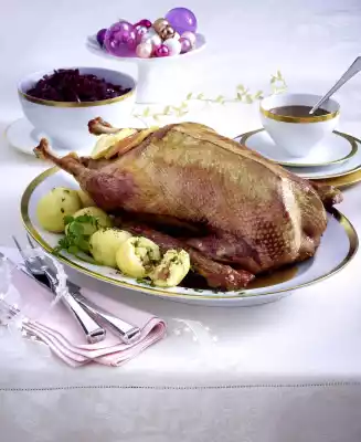 Boil up the prepared sauce. Take out the goose and keep it warm. Sieve the roast stock, degrease and pour into the sauce. Mix starch with 4 tablespoons of water. Thicken sauce with it, season to taste. Arrange everything.