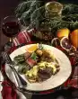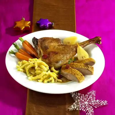 Wash the porcini and soak in 250 ml hot water for about 1/2 hour. Remove offal, neck and fat from the goose. Wash goose thoroughly inside and outside. Sprinkle abdominal cavity with salt and pepper. Cut out the fat gland. For the stuffing, grate mushrooms, clean and cut into small cubes. Peel and finely dice 1 onion and garlic. Wash the thyme, dab dry, put something aside for garnishing. Chop the rest finely. Fry mushrooms in hot oil until golden brown. Add thyme, onion and garlic and fry briefly, let cool down a little. Drain the porcini and collect the soaking water. Chop the mushrooms finely. Peel, quarter and core pears, cut into cubes. Mix well mushroom mixture, porcini, pears, nuts, cranberries and eggs. Season with salt and pepper. Stuff the goose with the mushroom mixture. Close the neck and belly opening with wooden skewers and tie up with kitchen string. Tie legs and wings together. Rub with salt and pepper. Put the goose with the breast side on a grid. Pour 1/8 litre water into the fat pan of the oven and push it under the goose. Roast in the preheated oven (electric cooker: 175 °C/ convection oven: 150 °C/ gas: level 2) for 3-3 1/2 hours. Peel and halve 3 onions. After 1 1/2 hours of frying time turn the goose. Put the onions and remaining offal in the fat pan and deglaze with 1/4 litre water. Finish frying the goose and during this time scoop it several times with roast stock. Turn the oven on approx. 15 minutes before the end of the roasting time (electric oven: 225 °C/ circulating air: 200 °C/ gas: level 4). Fry the goose until crispy. Peel the carrots, leaving a little green and wash them. Steam in little boiling salted water for about 10 minutes. Lift the goose from the grill and keep it warm. Pour frying stock through a sieve into a pot. Loosen the roast on the fat pan with goose stock and pour in. Degrease the stock. Add porcini water and cognac, bring to the boil, add sauce thickener while stirring and bring to the boil again briefly. Season to taste with salt and pepper. Cook spaetzle in boiling salted water for about 3 minutes. Melt butter and roast breadcrumbs in it. Drain spaetzle and carrots, let them drain. Sprinkle Spätzle with the breadcrumbs and butter mixture. Serve goose with filling, spaetzle, carrots and sauce. Garnish with thyme, cranberries and baby pears