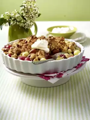 Wash and clean the gooseberries. Mix with sugar and place in a greased ovenproof dish. Cook in a preheated oven (electric cooker: 200 °C/ convection oven: 175 °C/ gas: level 3) for approx. 10 minutes. For the crumbles, melt butter and let cool slightly. Coarsely chop the almonds.