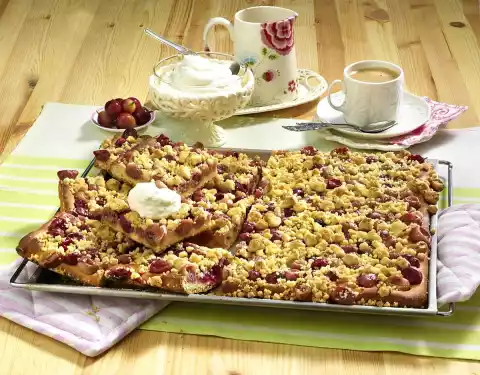 Add butter and knead into crumbles using the dough hooks of the hand mixer. Knead the dough on a floured work surface and roll out (approx. 32 x 37 cm). Place the dough on a greased and floured fat pan of the oven, cover and leave to rise in a warm place for approx. 20 minutes. Clean, wash and dry gooseberries. Spread the gooseberries and crumbles on the cake and bake in the preheated oven (electric range: 200 °C/ convection oven: 175 °C/ gas: level 3) for 20-25 minutes. Take the cake out of the oven and let it cool down on a kitchen grid. Whipped cream tastes good with it