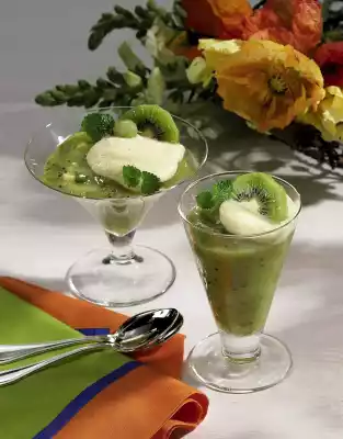 Simmer at medium heat for 5-8 minutes. Mix the kiwis, except for 4 slices for decoration, with the gooseberries. Stir in pudding powder, bring to the boil again and fill into dessert glasses. Let the groats cool down.