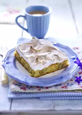Take the cake out of the oven, spread the meringue, leaving about 1 cm of edge all around. Bake the cake at the same temperature for about 15 minutes. Let them cool down. Dust with icing sugar before serving.