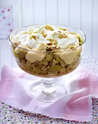 Breaking cookies into pieces. In a bowl or 6 individual bowls, alternately layer cookies and gooseberries. Pour cold vanilla sauce over them. Whip the cream until stiff and spread on the trifle. Create a swirl pattern with a knife or the back of a spoon. Sprinkle with flaked almonds and chill