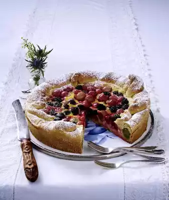 Sprinkle the yeast dough base with breadcrumbs. Spread blackberries and gooseberries on top. Pour the icing evenly over it. Bake in the preheated oven (electric range: 175 °C/ convection oven: 150 °C/ gas: level 2) on the bottom shelf for approx. 45 minutes. If necessary, cover the edge of the dough after approx. 30 minutes of baking time.