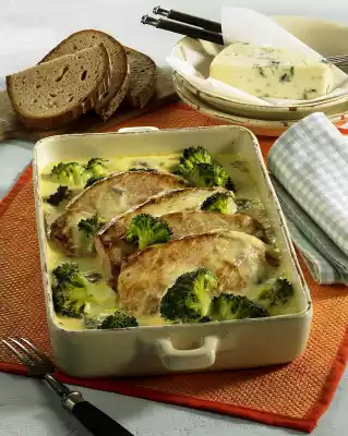 Season with salt and pepper. Heat cream and milk. Melt cheese in it. Stir in sauce thickener. Season to taste with salt and pepper. Put meat and broccoli into the mould. Pour sauce over it. Bake in the preheated oven (electric cooker: 200 °C/ convection oven: 175 °C/ gas: level 3) for approx. 10 minutes.