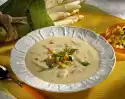 Melt butter in a pot. Sauté the celery in it. Take out 2 tablespoons and put aside. Add the onions to the celery and fry briefly. Pour on the stock, bring to the boil and simmer covered for about 25 minutes. Mash cheese with a fork and mix with cream. Pour the stock through a sieve, collecting the liquid. Bring the stock, cheese-cream sauce and pears with the sherry to the boil. Let everything simmer for about 5 minutes. Season to taste with salt and pepper.