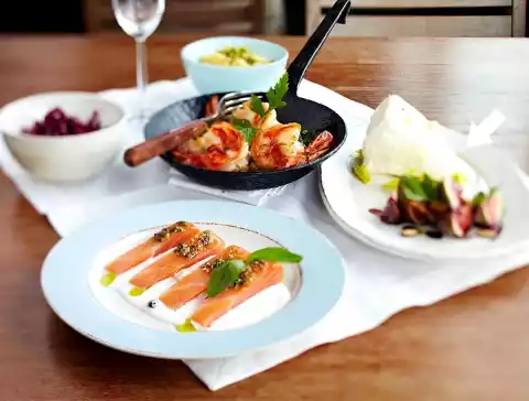 Sort the salad, rinse cold and drain well. Mix with the fig salad. Divide the cheese into 4 portions and serve with the fig salad. Drizzle cheese with oil.