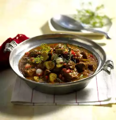 Drain the silverskin onions. Wash, clean, quarter and seed the tomatoes. Cut the flesh into small cubes. Wash the dill, pluck the bunting. Add prepared ingredients to goulash 10 minutes before the end of cooking time.