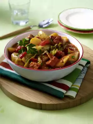 Heat the oil in a casserole. Brown the meat in it thoroughly. Season with salt and pepper. Fry the onion briefly. Stir in tomato paste and flour, sweat briefly. 3⁄4 Stir in l water. Add the potatoes and bring to the boil. Cover and stew for about 1 hour.