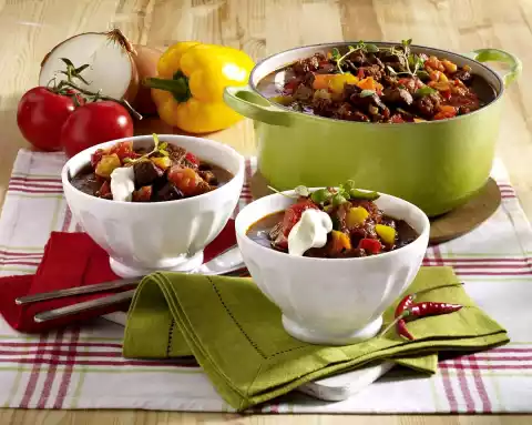 Season meat with salt and pepper and put it back into the pot. Cover and stew for 2-3 hours at low heat. Clean, wash and cut the peppers into rhombs. Add to goulash 30 minutes before the end of cooking time.