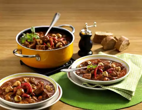 Deglaze with 3/8 litres of water and strained tomatoes, stir in Goulash-fix, bring to the boil and braise at low heat for about 1 1/2 hours. Stir from time to time. Clean, wash and cut the peppers into strips. Pour mushrooms on a sieve and let them drain. Add the mushrooms and peppers to the goulash about 30 minutes before the end of the cooking time. Press sausage meat out of the skin in small dumplings. Heat 1 tablespoon of oil in a pan. Fry the sausage meatballs in it. Fold the dumplings into the goulash. Season to taste with salt, pepper and dried marjoram.
