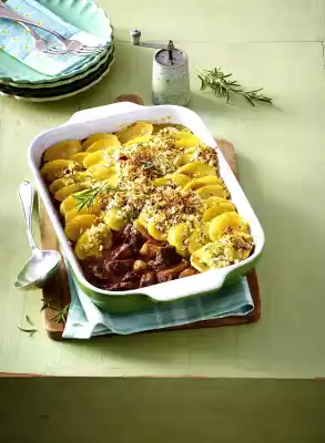Season goulash with salt and pepper. Pour into an ovenproof casserole dish (approx. 20 x 25 cm, 5 cm deep). Spread the potato slices in flakes. Sprinkle with rosemary crumbs and drizzle with olive oil.