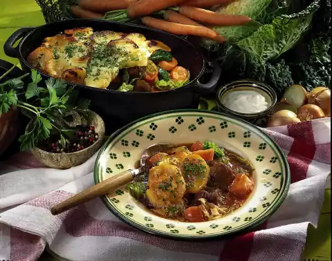 Season the goulash to taste and remove from the heat. Spread the potato slices on top. Mix sour cream with salt and pepper and pour over the potatoes