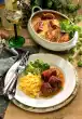 Wash the goulash, dab dry, salt and pepper. Peel the shallots. Heat clarified butter. Sauté the meat in it in portions, add the shallots and fry with them. Add mango chutney and mustard. Fill up with stock and cream and braise for about 1 hour. Drain the peaches and cut into slices.