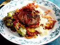 About 15 minutes before the end of the cooking time of the goulash, stir in the mushroom-porree-mix and 70 g cream. Preheat the oven (electric cooker: 200 °C/circulating air: 175 °C/gas: see manufacturer). Cut potatoes into slices of approx. 3 mm thickness.
