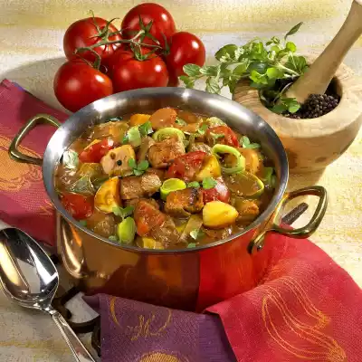 Wash the goulash and dab dry. Wash and clean the tomatoes and cut them into pieces. Heat oil. Sauté the goulash in it thoroughly. Season with salt, peppercorns and paprika. Deglaze with 1/2 litre water. Add tomatoes and braise for 1 hour.