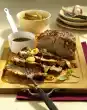 In the meantime peel, wash and halve the potatoes. Clean, wash and cut leek into rings. Pluck off marjoram leaves. Add potatoes, leek, 50 g cream and 400 ml water after 1/2 hour cooking time. Stir flour and 100 g whipped cream until smooth. Bind the finished goulash with it, bring to the boil again and season to taste with salt and pepper. Serve sprinkled with fresh marjoram leaves