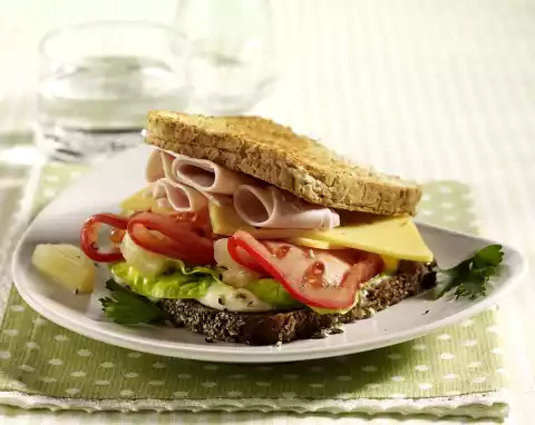 Drain the pineapple. Clean, wash and slice the tomato. Wash and drain the lettuce. Spread wholemeal bread with lettuce cream, arrange lettuce on top. Then top with tomato slices, pineapple, cheese and turkey breast.