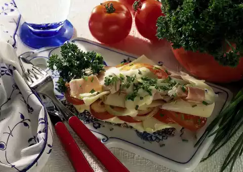 Clean, wash and slice the tomato. Peel onion and cut into thin rings. Wash the chives and cut into small rolls. Cut the slices into strips. Spread bread with 1 tablespoon of salad cream and cover with tomatoes, onions, cheese and slices of Kasseler.