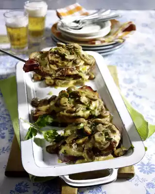 Remove from the pan and fry the rest of the meat in the same way. Remove from the pan. Sauté the onions in the frying fat and remove from the pan. Fry the mushrooms in three portions in the pan while turning.
