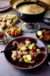 Drain the vegetables. Drain potatoes, rinse with cold water and peel. Fry stuffed mushrooms and tomatoes, chorizo, bacon and steaks on the grill of the raclette machine for 3-6 minutes, turning if necessary.