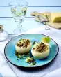 Unscrew the stems from the mushrooms. Cut the tomatoes crosswise. Pour some herb butter into the mushrooms and tomatoes.
