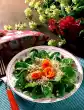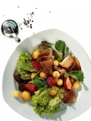 Clean, wash and cut the salad into bite-sized pieces. Remove seeds from melon. Cut out small balls from the flesh with a ball cutter. Wash, clean and halve the strawberries.