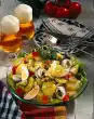 Mix vinegar, salt, pepper and some sugar. Whip the oil into it. Mix the salad ingredients and vinaigrette. Arrange each with a few slices of ham on four plates