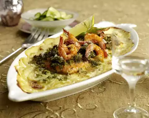 Peel the potatoes, wash them thoroughly and cut them into fine slices. Wash fish, pat dry and season with salt and pepper. Peel prawns, except for the tail fin, and remove the intestines.