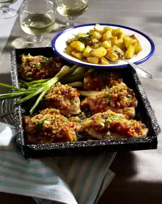 Season again with salt and pepper. Add the parsley, except for something to garnish. Place the cutlets on a baking tray and spread the tomato and onion mixture on top. Bake in the preheated oven (electric cooker: 175 °C/ convection oven: 150 °C/ gas: level 2) for about 35 minutes.