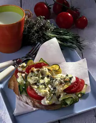 Spread slices of bread evenly with fat. Spread zucchini and tomato slices on top. Season with a little salt and pepper