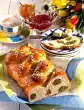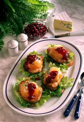 Season the meat with salt and pepper and put it on a baking tray. Put peach halves on the meat and cover with cheese. Bake under the preheated grill for about 2 minutes. Arrange on the prepared bread slices. Serve with cranberries