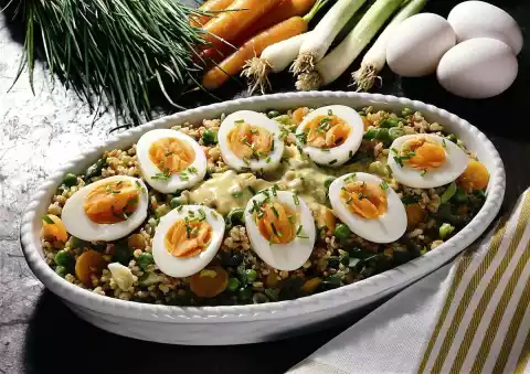 Continue cooking for about 3 minutes. Rinse, peel and halve the eggs. Stir the vegetables into the rice mixture. Pour into a flat bowl. Garnish with egg halves. Wash the chives, cut them into small rolls and sprinkle them over the rice.