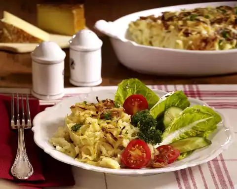 Mix the spaetzle with the cheese and place in a greased casserole dish. Spread onions over the cheese spaetzle. Bake in the preheated oven (electric cooker: 200 °C/ convection oven: 175 °C/ gas: level 3) for 20-25 minutes.