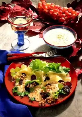 Clean, wash and drain the salad and pluck into bite-sized pieces. Wash the grapes. Halve the blue grapes and remove seeds. Slice cheese into thin slices with a cheese slicer. Stir mayonnaise, yoghurt and orange juice until smooth.