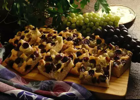 Mix everything to a smooth dough with the dough hooks of the hand mixer. Grease the fat pan of the oven. Spread the dough evenly over it, spread grapes over it. Bake in the preheated oven (electric oven: 200 °C/ gas: level 3) for 30-40 minutes.