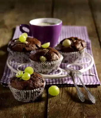 Mix flour, baking powder and cocoa, add and stir in. Stir in nut nougat cream. Fold in almonds and chocolate. Fold in grapes. Line the hollows of a muffin tray (12 hollows) with a paper sleeve each.