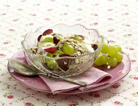 Lightly roast the oat flakes in a pan without fat. Wash and halve the grapes. Put oat flakes, yoghurt and grapes in a bowl. Mix sugar and cinnamon and sprinkle over the muesli