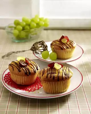 Mix flour and baking powder and stir in the cream alternately. Mix in the grapes. Line 12 depressions of a muffin tin with one paper baking cups each. Spread the dough evenly in them. Bake in the preheated oven (electric cooker: 175 °C/ convection oven: 150 °C/ gas: level 2) for approx. 25 minutes. Remove from the oven and leave to cool in the mould on a cake rack for approx. 10 minutes. Remove muffins from the tin and let them cool down. Melt the chocolate coating over a warm water bath. Let cool down briefly. Pour into a piping bag, cut off a small corner.